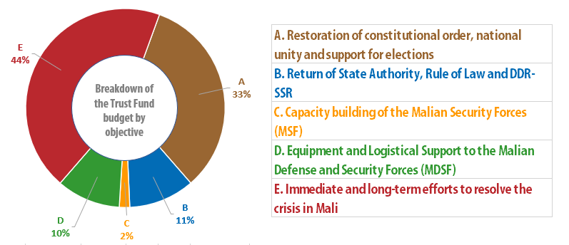 The United Nations Trust Fund for Peace and Security in Mali was created at the request of the Security Council (Resolution 2085 (2012)). The Fund aims to support the efforts of the Government of Mali to face the crisis and guarantee the country's long-term development prospects. More specifically, it is about helping to ensure that Mali succeeds in restoring constitutional order, and in national unity. The Fund also supports the various planned electoral processes; the return of state authority, the rule of law and the reform of the security sector as well as the process of disarmament, demobilization and reintegration / reintegration of ex-combatants (RSS / DDR). The Trust Fund is also intended to help strengthen the technical, logistical and material capacities of the Malian Defense and Security Forces (MDSF). Finally, it participates in immediate and long-term efforts to resolve the crisis in Mali.
