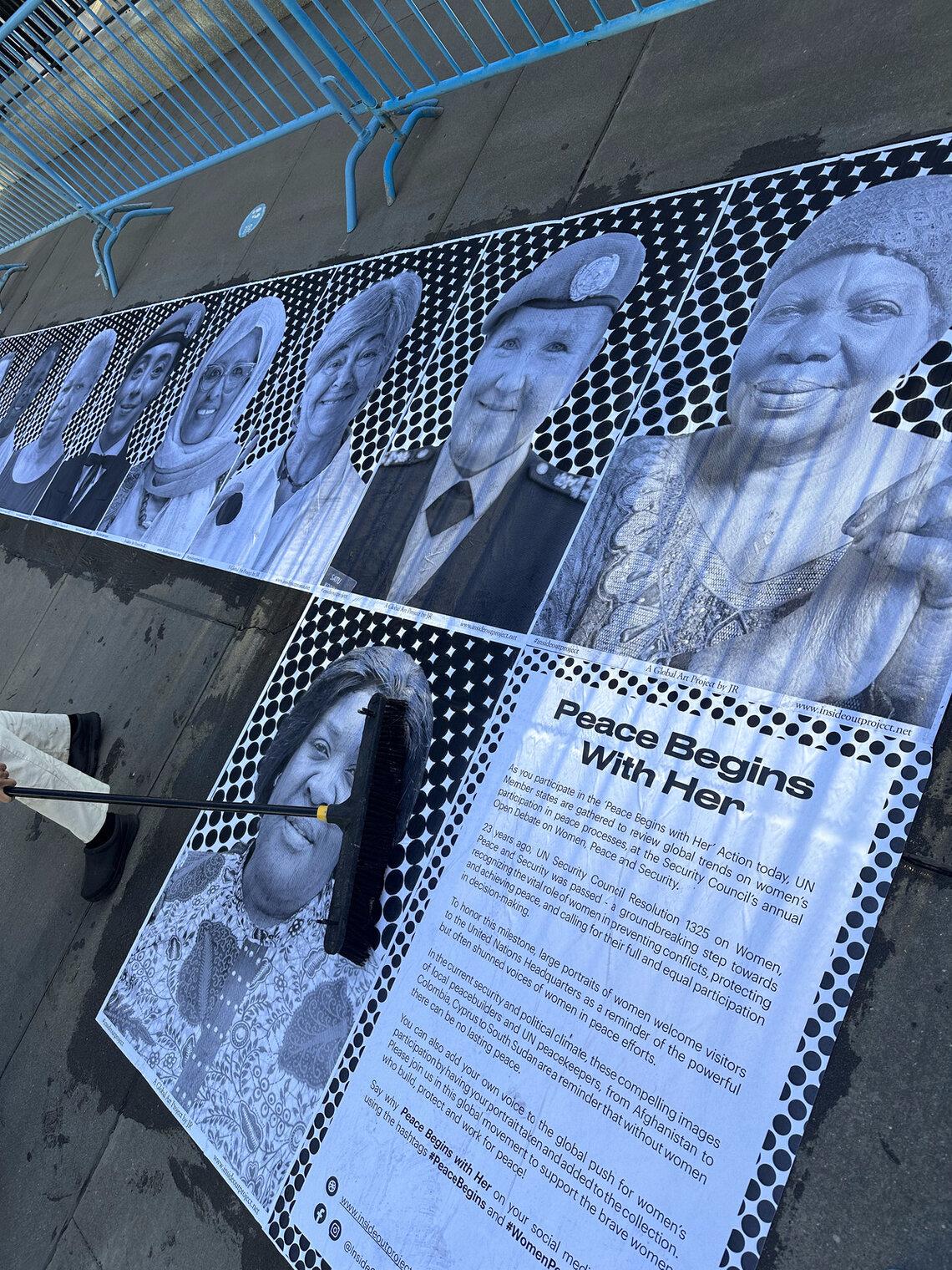 A view of the United Nation’s interactive photographic exhibition ‘Peace Begins with Her’ featuring portraits of women peacebuilders and peacekeepers. The exhibit, held outside of United Nations Headquarters in New York, paid tribute to women’s contribution to peace. Pétronille Vaweka is pictured on the top right. (Photo: Camilla Stamp)