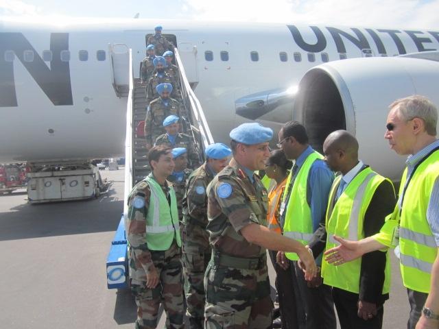 Goma, 19 September 2012 – The first inaugural flight to the Rwandan capital, Kigali, with a Boeing 767 of Ethiopian Airlines registered 300 ER, took place on Tuesday, 18 September 2012, as part of the Global Field Support Strategy; several officials of the United Nations Organization Stabilization Mission in the Democratic Republic of Congo (MONUSCO) witnessed the arrival of troops on this flight.