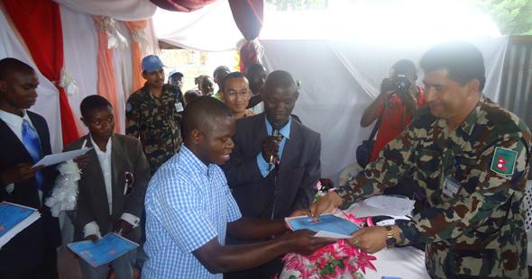 Beni, 30 September 2011 – Peacekeepers of the 15th Nepalese Battalion awarded seven students their graduation certificates at a ceremony organized in Beni, Nord Kivu province, on 28 September. The graduation comes as the crowning of nine months of training in English literature and computer science at the Vocational Training Centre/Peace and Development (VTC/PD) set by the Nepalese Peacekeepers of the United Nations Stabilization Mission in the Democratic Republic of Congo (MONUSCO).