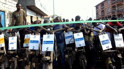 Saturday, March 16, 2013, no less than one hundred and ten Tshukudistes, both amateurs and professionals, took part in a 6, 25 km long race through the main streets of the city. They show to the world that Goma is a vibrant city where life is stronger than fear and violence. This was not only a way to pay tribute to the Tshukudistes for their vital role in the socio-economic development of the city but also an opportunity to raise awareness about volunteering and solidarity, both deeply incorporated in Congolese society, no matter the social background or the economic condition. Indeed, this fundraising event was organized and held by the poorest. They took the challenge of riding a forty-kilogram Tshukudu all over the city center; by doing so, they raised money for Kitchanga (a recently war-torn town in North-Kivu).