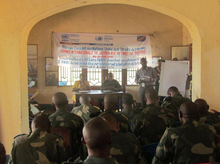Uvira, 8 July 2015 – The United Nations Joint Human Right Office, UNJHRO, in collaboration with Sukula II military operations command in the South-Kivu province and the local Military Public Prosecution Office organized on Wednesday 8 July 2015 in Uvira a sensitization on the Act No 0011/008 of 9 July 2011 bearing on the criminalization of torture in the DRC. This activity is part of the commemoration of the International Day in support of the victims of torture commemorated on 26 June of each year.