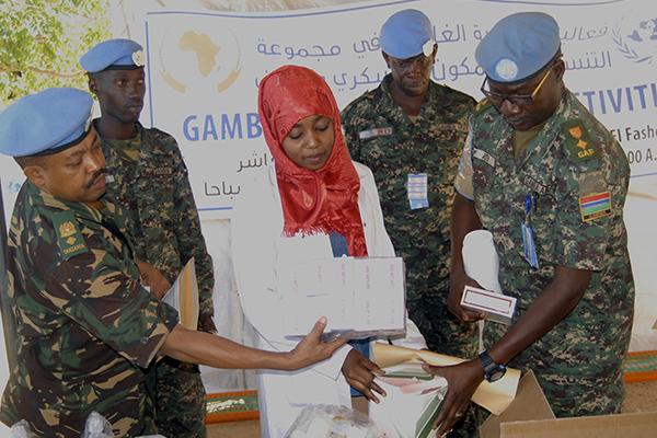UNAMID’s Gambian peacekeepers handed over essential medical supplies to the clinic at the Abu Shouk camp for internally displaced persons (IDPs), near El Fasher, North Darfur.Photo by Tijan Kujabi, UNAMID.