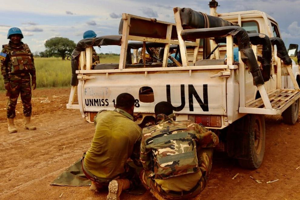 Two uniformed personnel crouch near the rear of a UN-marked pickup truck on a dirt road, while another stands nearby wearing a blue helmet.