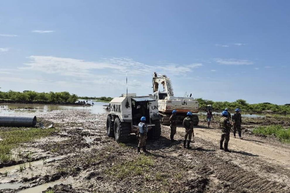UN peacekeepers in blue helmets stand on a muddy road near heavy UN machinery and pipes, with water and greenery in the background.