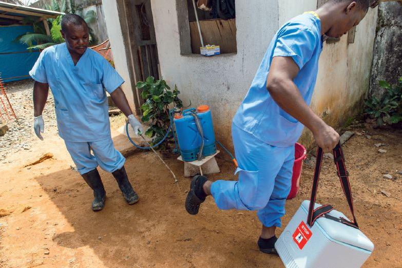 A Liberian Ministry of Health worker in Monrovia sprays the soles of a colleague’s shoes at an Ebola Isolation Clinic as they leave with blood specimens for testing. Photo: Staton Winter | UNMIL | 11 Jul 14 On 16 August 2014…