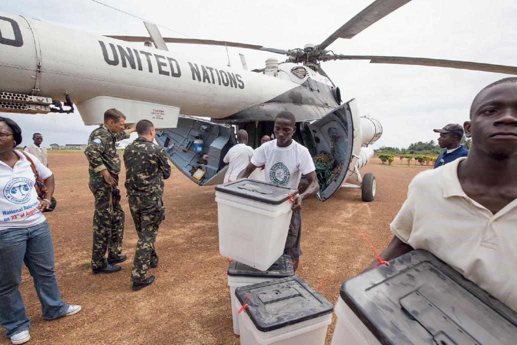 An UNMIL helicopter arrives to deliver ballots for the Liberian Presidential Elections.Photo: Staton Winter | UNMIL | 30 Sep 11 UNMIL provided support to three elections and was an important enabler in their success. Liberia…