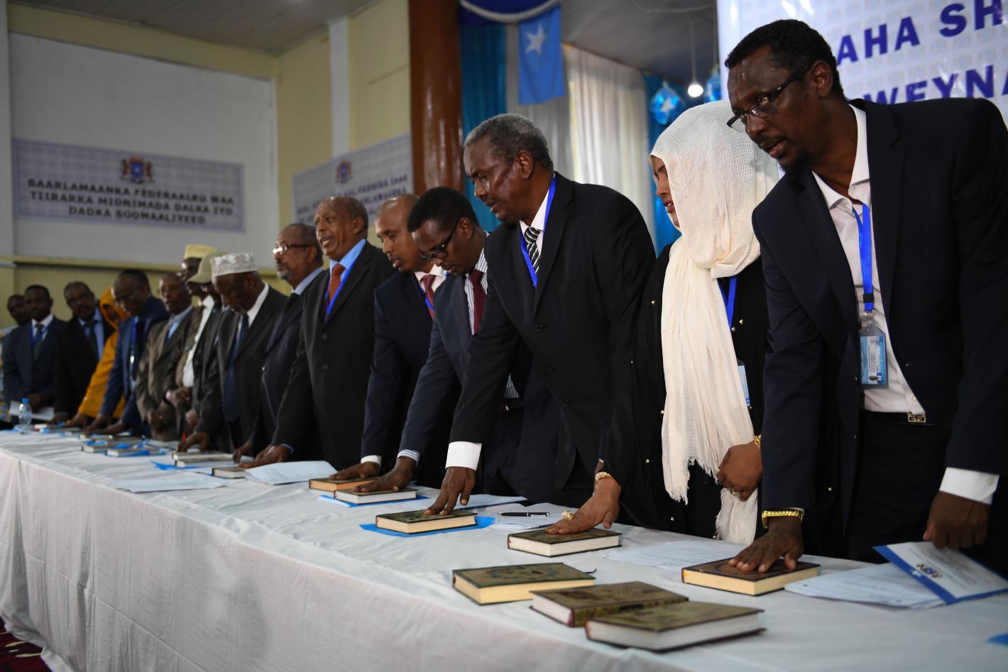 New parliamentarians are sworn in during an inauguration ceremony for members of Somalia's Upper House and the House of the People in Mogadishu on 27 December 2016. UN Photo.
