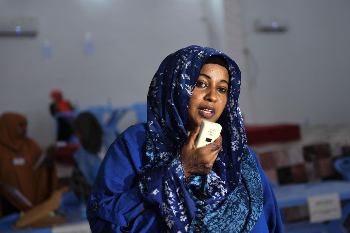 Sahra Yusuf Ege, the winner of a seat in the House of the People for Somaliland, gives a victory speech to delegates during Somalia's ongoing electoral process in Mogadishu, Somalia, on 25 December 2016. UN Photo.