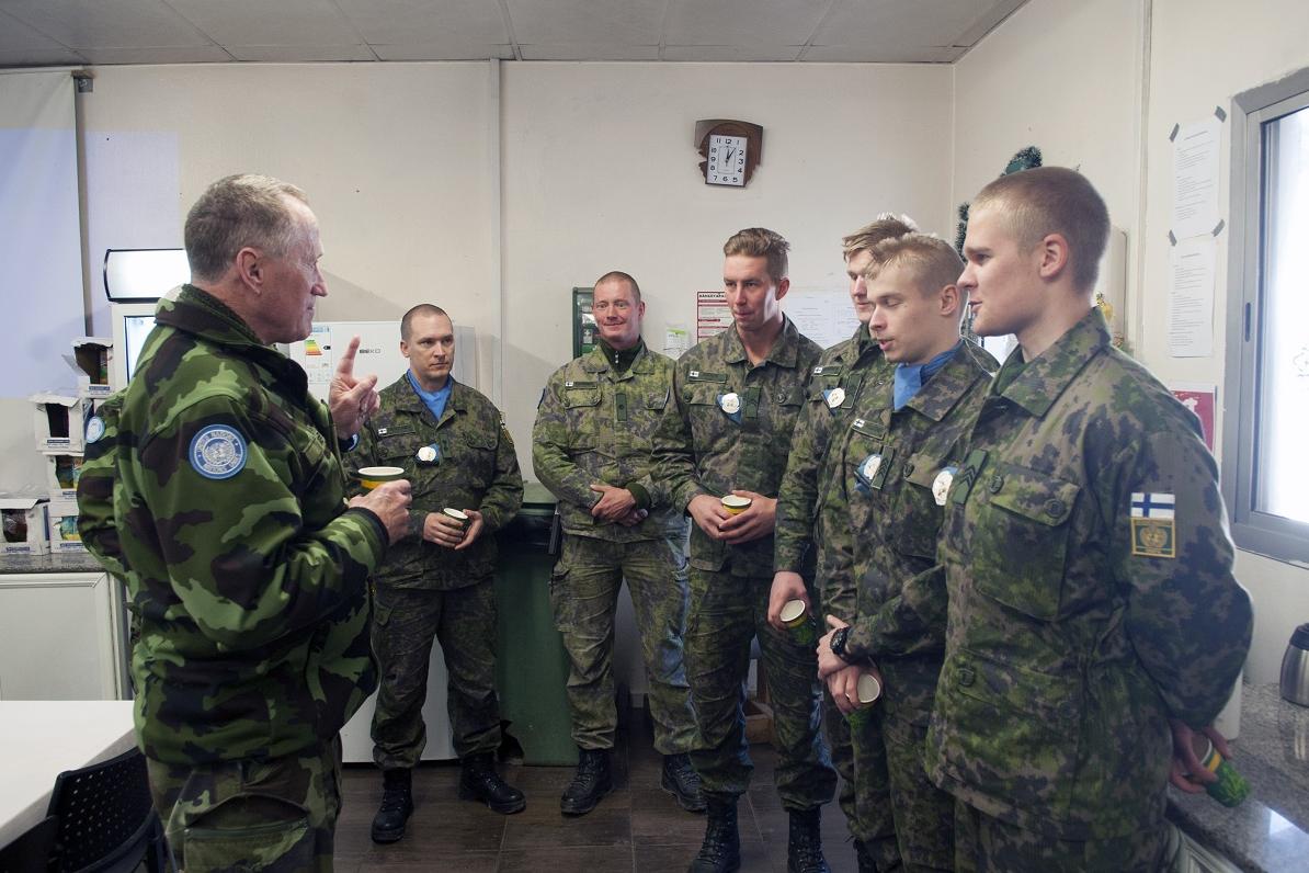 Major General Michael Beary, UNIFIL’s Head of Mission and Force Commander, chats with peacekeepers from Finland.