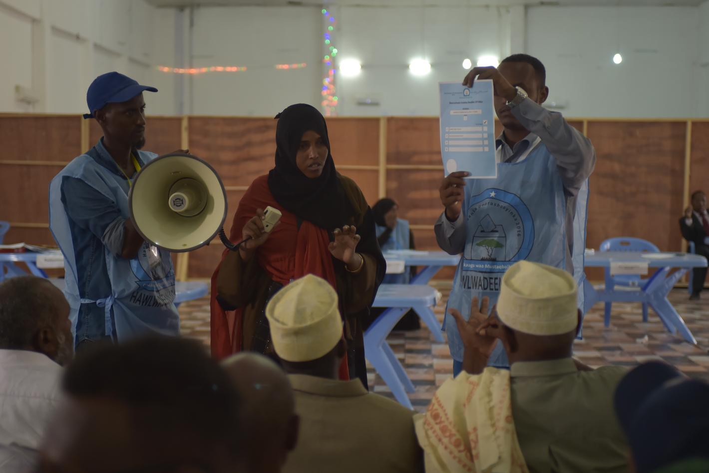 Election officials explain the voting process to delegates about to vote in Somaliland's election to pick members of parliament in Mogadishu, Somalia, on 10 December 2016. Somalia is currently electing members to the House of the People, who will then go on to elect Somalia's new president along with the Upper House of parliament. UN Photo