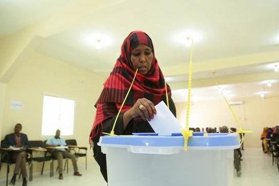 A lady delegate casts her vote during the electoral process to choose members of the Lower House of the Somali Parliament in Garowe, Puntland, Somalia on November 05, 2016. UNSOM Photo.