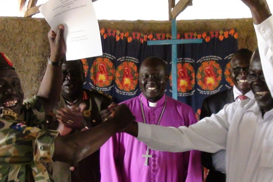Bishop Paul Yogusuk urges leaders and citizens to unite as a nation. Photo from 8 December 2015, on the celebration of the Wonduruba agreement between local communities and an SPLA unit in the area. Photo: Radio Tamazuj