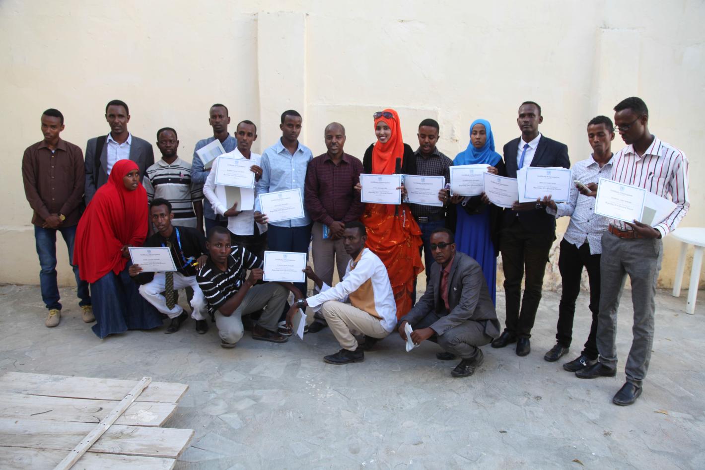 Kismayo based journalists in a group photograph at the end of a training workshop on electoral reporting. UN Photo