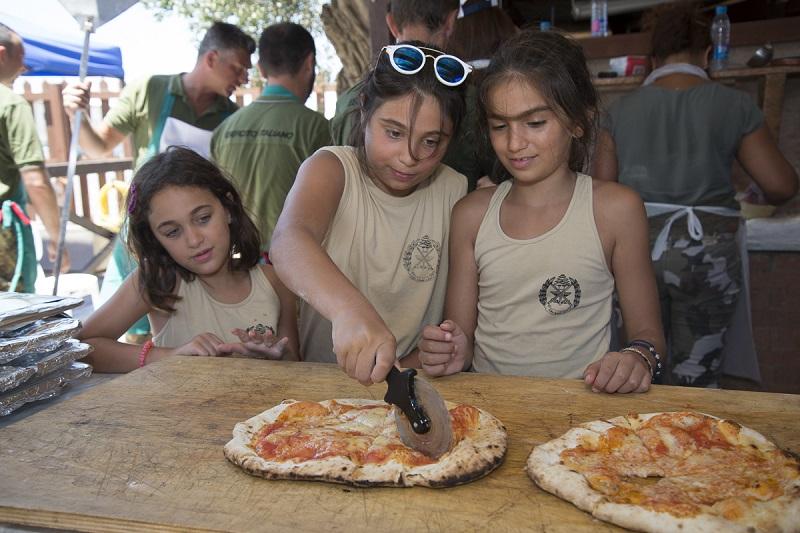 Young people cut through the freshly baked pizza made at UNIFIL's Italian Base in Chama.