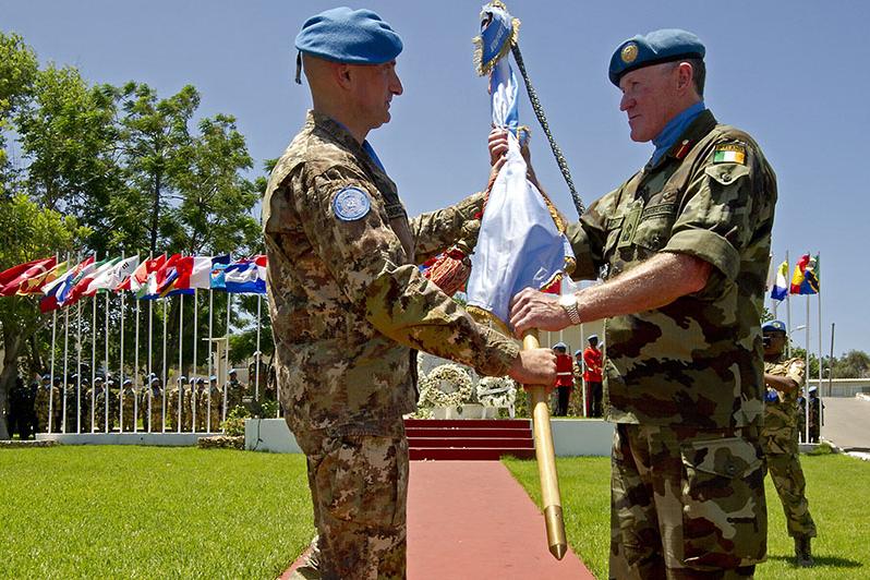 Outgoing Force Commander Major-General Luciano Portolano hands over the UN flag to Major-General Michael Beary.