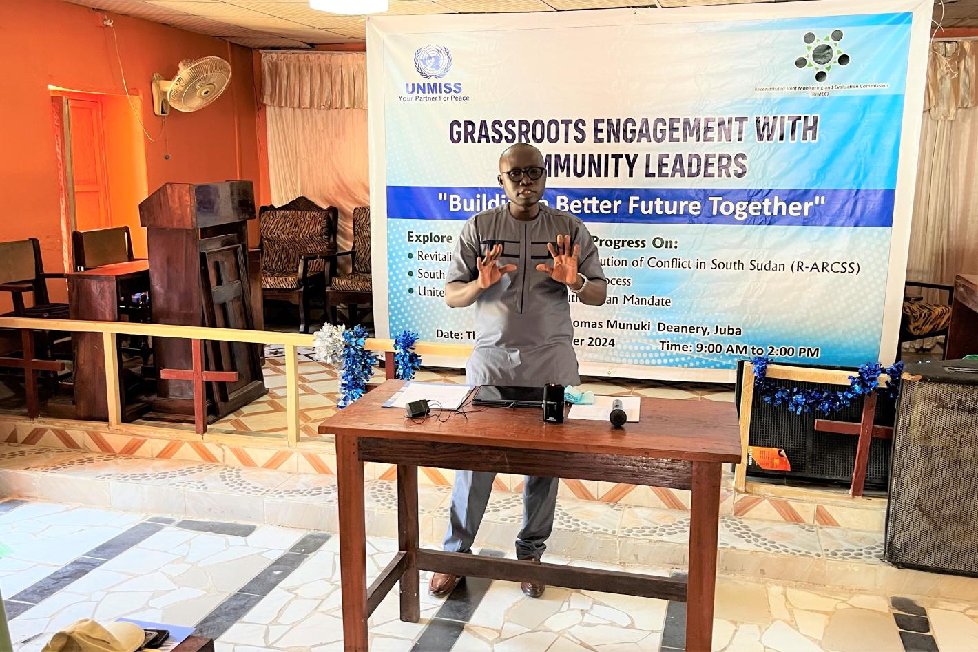 At a recent outreach event organized by UNMISS and peace partners in the Juba neighbourhood of Muniki, residents asked pertinent questions about social and political developments in their country. Photo by Blessings Samuel Phumisa/UNMISS.