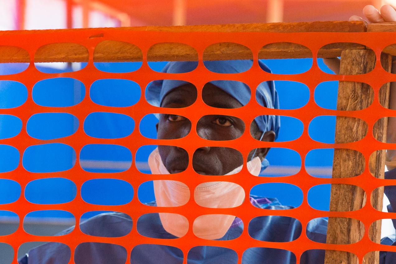 Behind a red-netted fence, childcare worker Fanta Camara gives a bath to one-and-a-half year old Massidigbe in the Childcare Center of the Ebola Treatment Unit (ETU) in Nzerekore, in the forest area of southeastern Guinea. It…