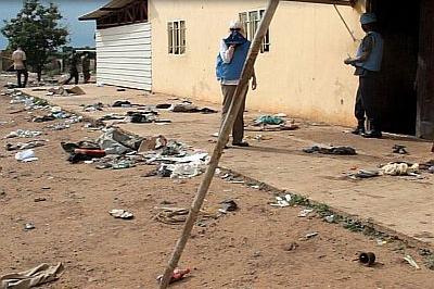 UNMISS staff and peacekeepers outside mosque in Unity State capital Bentiu where more than 200 people were killed on 15 April. Photo: UN/Amanda Weyler