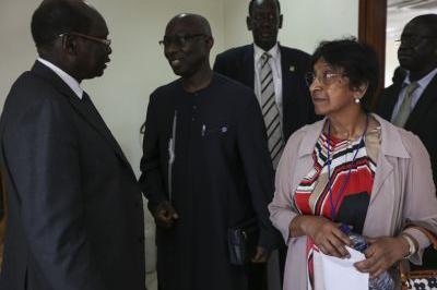 UN High Commissioner for Human Rights Navi Pillay with UN special envoy for the prevention of genocide Adama Dieng and South Sudanese Minister of Foreign Affairs Barnaba Marial Benjamin after meeting to discuss human rights…