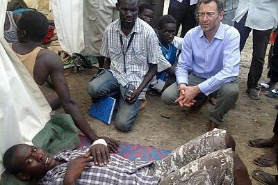 Deputy Special Represenative of the UN Secretary-General Toby Lanzer talking to an injured man at UNMISS protection site in Unity State capital Bentiu. Photo:UNMISS/Tina Turyagyenda