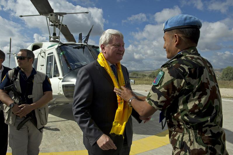 Under Secretary-General for Peacekeeping Herve Ladsous is welcomed by a UNIFIL Nepalese peacekeeper at the start of his Blue Line tour.