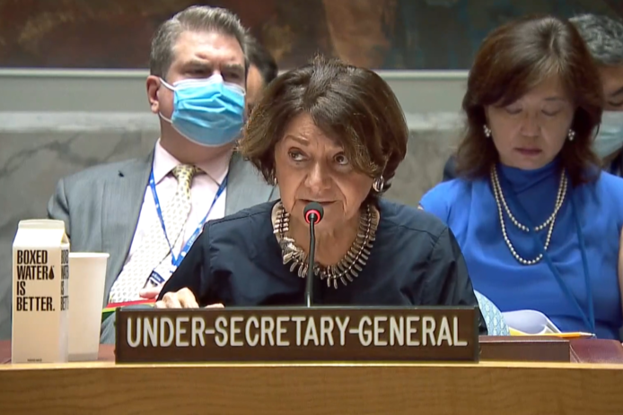 Lynn Hastings (on screen), Deputy Special Coordinator for the Middle East Peace Process, United Nations Resident Coordinator and Humanitarian Coordinator for the Occupied Palestinian Territory, briefs the Security Council meeting on the situation in the Middle East, including the Palestinian question. (UN Photo/Loey Felipe - 26 July 2022)