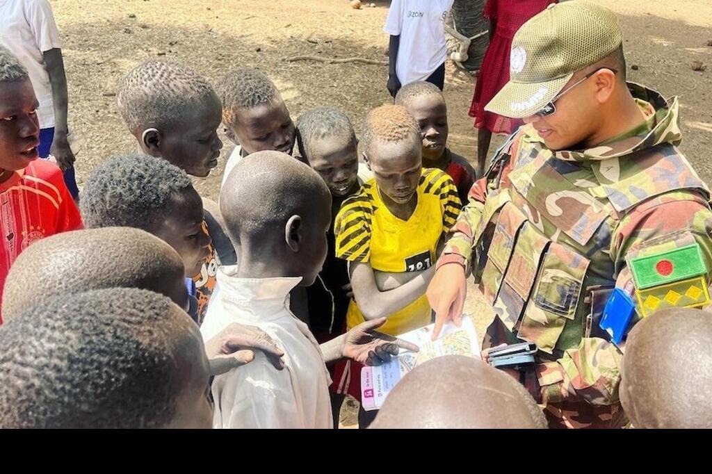 An UNMISS peacekeeper possibly getting directions from young residents of Akac in a remote part of Twic County, reached by an air patrol. Photos by Zejin Yin/UNMISS