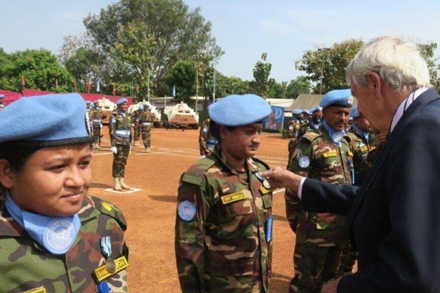 On his recent visit to Wau, Nicholas Haysom, Special Representative of the Secretary-General and Head of UNMISS, visited a training site for South Sudanese military personnel, discussed key issues with state authorities and awarded medals to 848 peacekeepers from Bangladesh. Photo by Dawit K.Tedla/UNMISS.