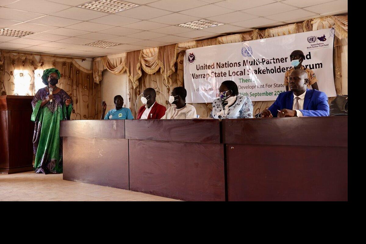 Some 80 people in Kuajok engaged in spirited discussions on the need to implement all provisions of the Revitalized Peace Agreement at a forum jointly facilitated by UNMISS and the United Nations Multi-partner Fund. Photo by Zejin Yin/UNMISS.