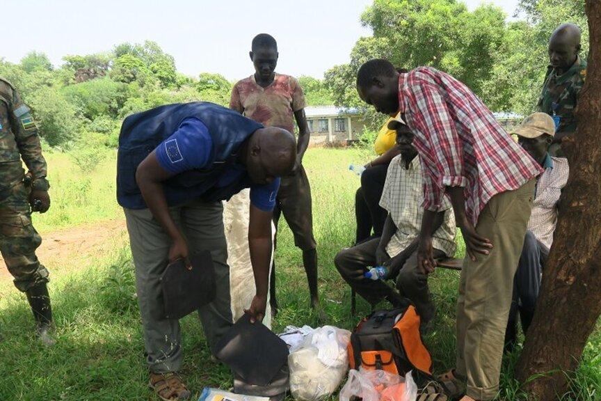 UNMISS peacekeepers with residents of Lafon County, who managed to recover goods stolen from a humanitarian partners as one of its convoys was recently ambushed. Photos: Moses Yakudu/UNMISS