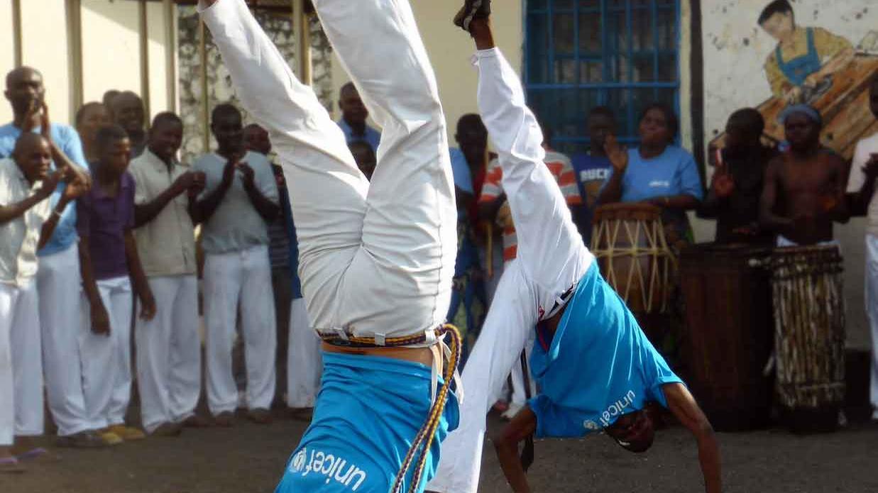 Ginga, cadera, tres taladji, auxilio, esquiva base, ... forty children practice together the steps of capoeira under the supervision of Dieudonné and Rafael, capoeira instructors and UN Volunteers in charge of the ‘’Capoeira…