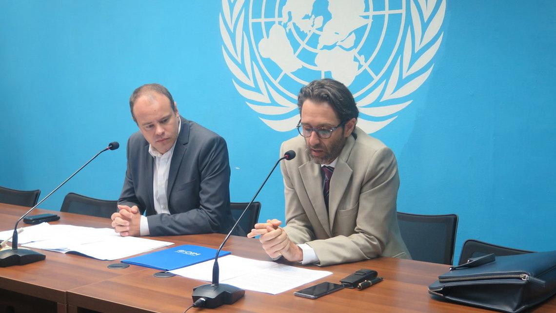 Le porte-parole de la MONUSCO par intérim, Mathias Gillmann, et le chef de Mission de l’OIM en RDC, Fabien Sambussy. Photo MONUSCO/ Lydie Betyna