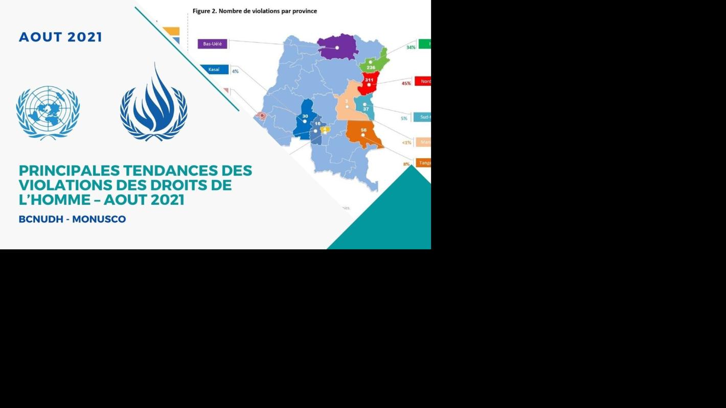 Durant le mois d’août 2021, le BCNUDH a documenté 739 violations et atteintes aux droits de l’homme en République démocratique du Congo, soit une augmentation significative de 50% par rapport au mois de juillet (492 violations). Cette hausse est due aux résultats, au cours du mois d’août 2021, de deux missions d’enquête effectuées par le BCNUDH sur des allégations de violations des droits de l’homme par des militaires des Forces armées de la République démocratique du Congo (FARDC) et d’atteintes aux droits de l’homme par des groupes armés dans les provinces de l’Ituri et du Nord-Kivu. La confirmation de ces violations et atteintes commises depuis le mois de mai s’est traduit par un accroissement de l’ordre de 66% du nombre des violations attribuables aux agents de l’Etat et de 35% du nombre d’atteintes attribuables aux combattants des groupes armés par rapport au mois de juillet.
