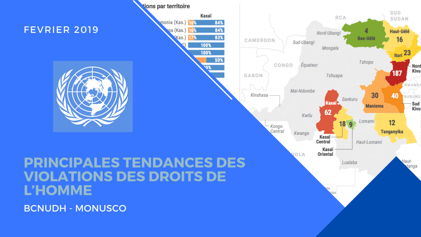 En février 2019, le BCNUDH a documenté 495 violations des droits de l’homme en RDC. Ce chiffre représente une diminution par rapport au mois de janvier 2019 (574 violations). Sur l’ensemble du territoire, les agents de l’Etat sont responsables de plus de 52% des violations documentées, dont les exécutions extrajudiciaires de 36 personnes, parmi lesquelles au moins deux femmes, tandis que près de 48% ont été perpétrées par les combattants des groupes armés, dont les exécutions sommaires de 83 civils, dont au moins 23 femmes.