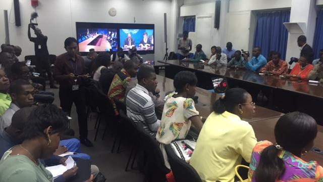 La MONUSCO organise chaque mercredi une conférence de presse hebdomadaire qui sert d’espace de communication de la Mission et de toutes les Agences onusiennes en RD Congo. La conférence de presse est diffusée en direct sur la radio Okapi et sur les plateformes web de la MONUSCO.