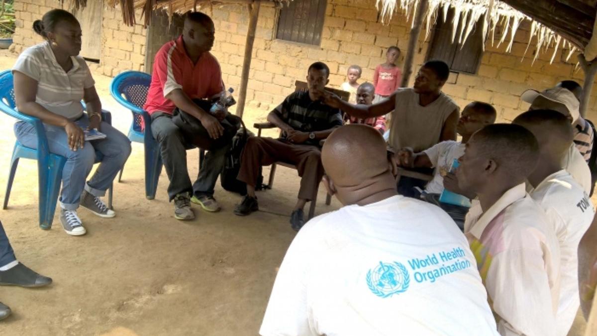L’équipe conjointe des experts MSP-OMS s’entretenant avec un chef de groupement et des membres de sa communauté sur les mesures d’hygiène individuelle et collective. © OMS/ Hélène Komerwa.