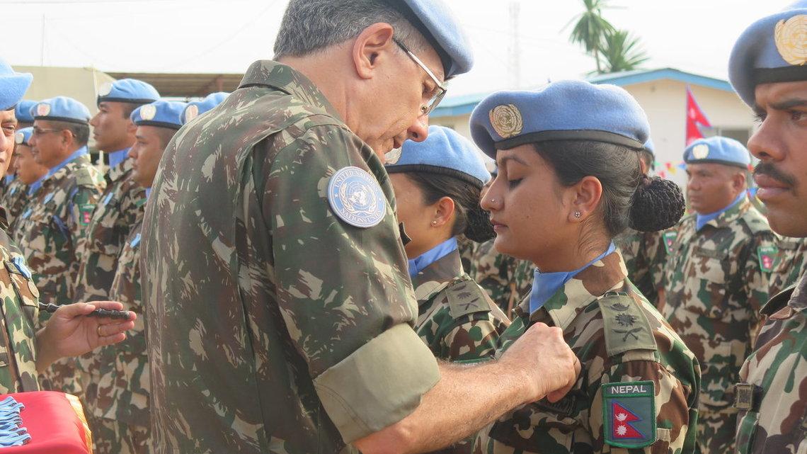 Le Commandant de la Force de la MONUSCO remet la médaille des Nations Unies aux casques bleus népalais. Photo MONUSCO/Guy KAREMA