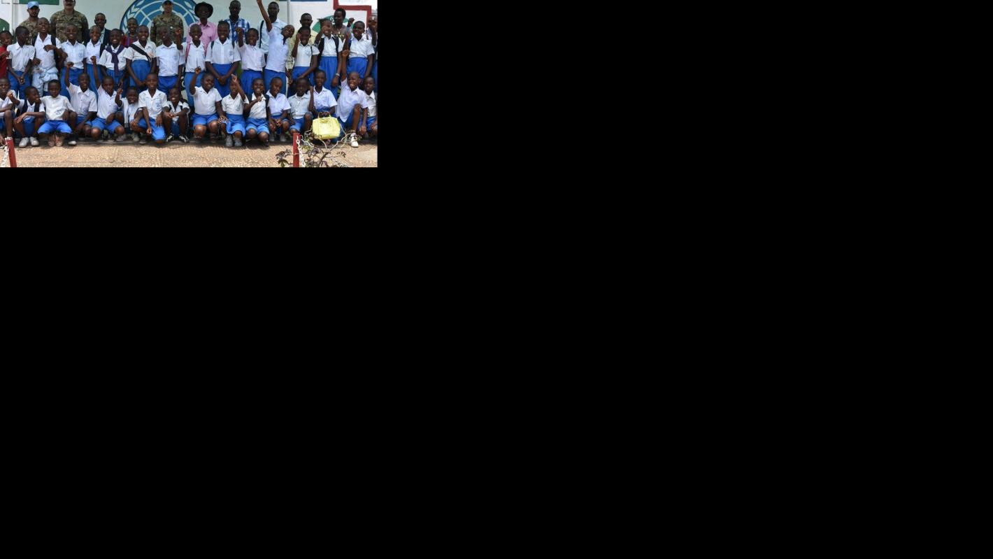 Photo de famille des élèves et enseignants du complexe scolaire ESPOIR d’Uvira avec les responsables de la base militaire du contingent pakistanais. Photo MONUSCO/Bilamekaso TCHAGBELE