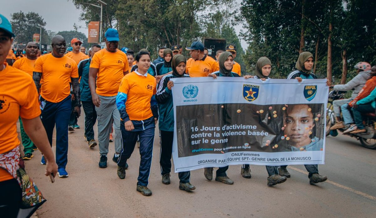 Le 6 décembre, du personnel militaire, civil et policier de la MONUSCO, des agents de la Police nationale congolaise et des organisations non gouvernementales ont parcouru près de 3,5 kilomètres, de l’aéroport de Bunia jusqu’au camp militaire Ndoromo. En tête du cortège, le chef de bureau de la MONUSCO en Ituri et le commandant du Secteur Nord, vêtus de polos orange, ont brandi des banderoles portant des messages forts : « Pas d’excuse pour les violences sexuelles ». L’initiative visait à interpeller l’opinion publique et à mobiliser les habitants de Bunia pour mettre fin à ces violences qui brisent des vies, bouleversent des familles et compromettent la paix.