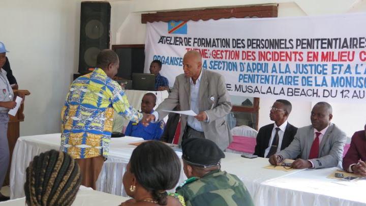 Kalemie - 15 Juillet 2016 : La session de formation a regroupé 21 membres du personnel pénitentiaire, dont 7 femmes. L’objectif est de renforcer les capacités techniques et professionnelles du personnel commis à l’administration pénitentiaire, incluant des éléments de la Police Nationale Congolaise et des FARDC, spécialement affectés à la sécurité de la prison centrale de Kalemie. La formation a porté principalement sur la gestion des incidents de sécurité au sein des prisons. Cette activité fait partie de la mise en œuvre du mandat de la Section d’Appui à la Justice et à l’Administration pénitentiaire qui est de renforcer les capacités des institutions judiciaires et pénitentiaires pour une lutte plus efficace contre l'impunité.