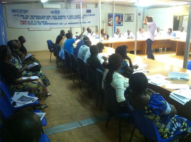 L’atelier de sensibilisation sur le thème «Droits de l’homme et élections» qui a préparé ses acteurs au monitoring des droits de l’Homme en période électorale et qui a permis la mise en place de l’OMDHE a réuni 35 membres des ONG des droits de l’Homme et des représentants des partis politiques basés en Ituri. Pendant deux jours, les participants ont échangé sur différentes questions d’actualité dont les libertés fondamentales en période électorale ; les Droits de l’Homme et élections, les Droits et Obligations des partis politiques en période électorale ; le monitoring des droits de l’Homme en période pré-électorale et le monitoring des manifestations.