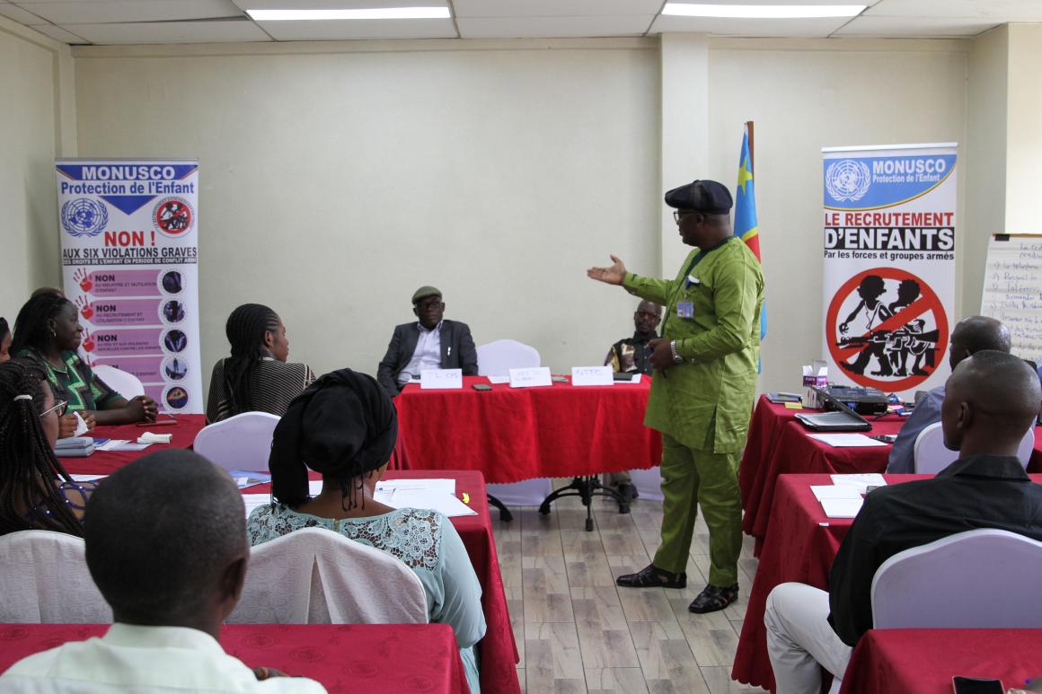 On notesix graves violations des droits de l’enfant en période de conflit armé : meurtre et mutilation d’enfant, recrutement et utilisation d’enfant, viols et violences sexuelles contre les enfants, enlèvement d’enfants, attaques contre les écoles et hôpitaux et refus d’accès à l’assistance humanitaire aux enfants. Ces violations ont été rapportées aux participants. « Pour la MONUSCO,la protection implique trois principaux acteurs différents : l’agresseur, le protecteur et la victime », a indiqué Justin Vuguvugu, l’un des facilitateurs de l’atelier et membre de la section Protection de l’enfant au sein de la MONUSCO.
