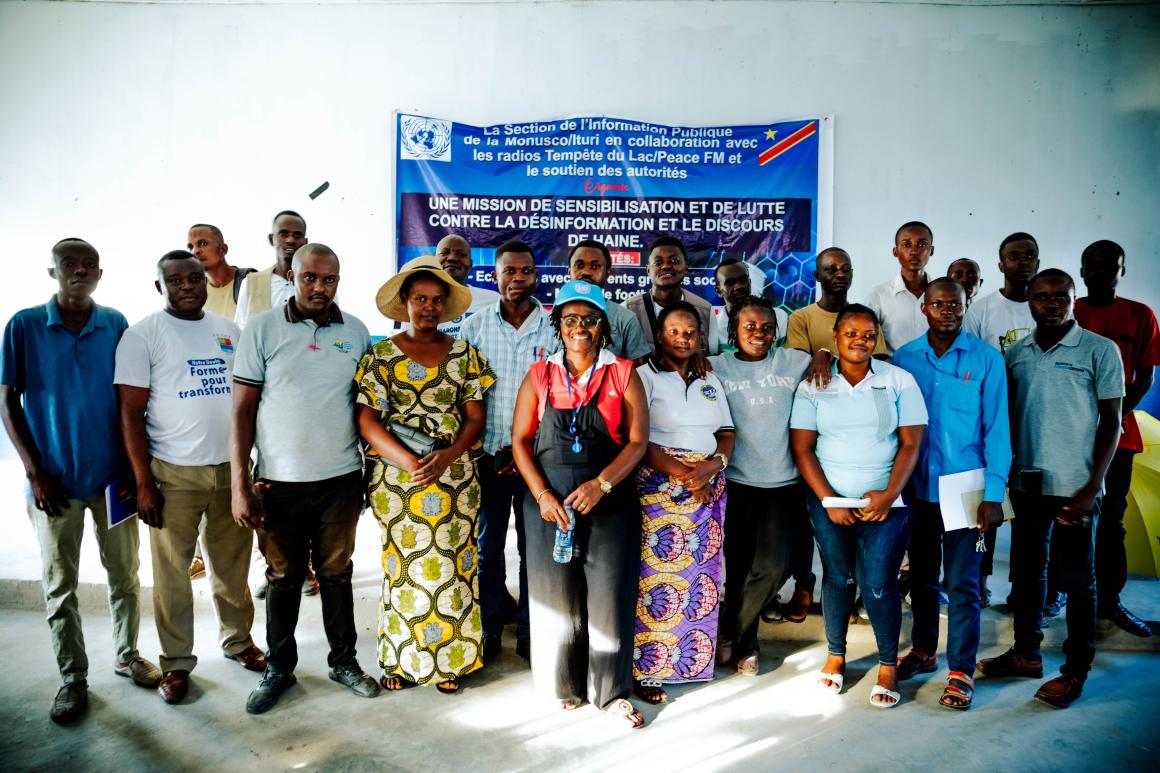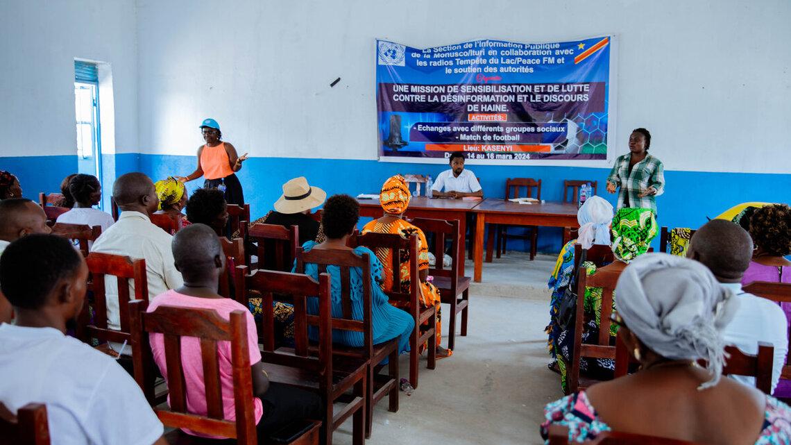 En mars 2024, la MONUSCO a organisé une série d’activités de sensibilisation contre la désinformation et les discours de haine à Kasenyi, dans le secteur de Bahema Sud, en territoire d’Irumu, province de l’Ituri. Des journalistes, des leaders de la société civile, des membres d’associations de femmes et de jeunes se sont réunis récemment pour échanger sur ces fléaux qui menacent la cohésion sociale et le vivre-ensemble dans une région confrontée à de multiples défis sécuritaires. Les autorités coutumières ont également été impliquées dans cette lutte.