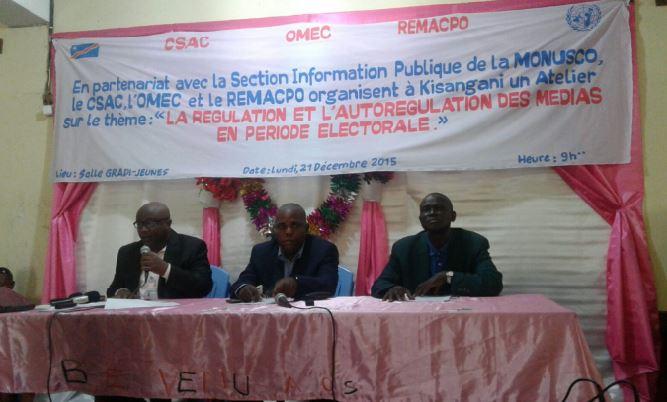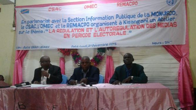 Kisangani, le 21 décembre 2015 - Le Bureau de l’information publique de la MONUSCO, en collaboration avec le Conseil supérieur de l’Audio-visuel et de la Communication (CSAC), l’Observatoire des Médias congolais (OMEC) et le Réseau des Médias Associatif et Communautaire, REMAC/PO, a organisé ce lundi 21 décembre 2015, à l’intention d’une cinquantaine de journalistes, responsables des medias et organisations des medias, un atelier de formation sur le thème de la régulation et de l’autorégulation des medias en période électorale, sous la Présidence du Maire adjoint de la Ville de Kisangani, M. Justin Ramazani Tabora.