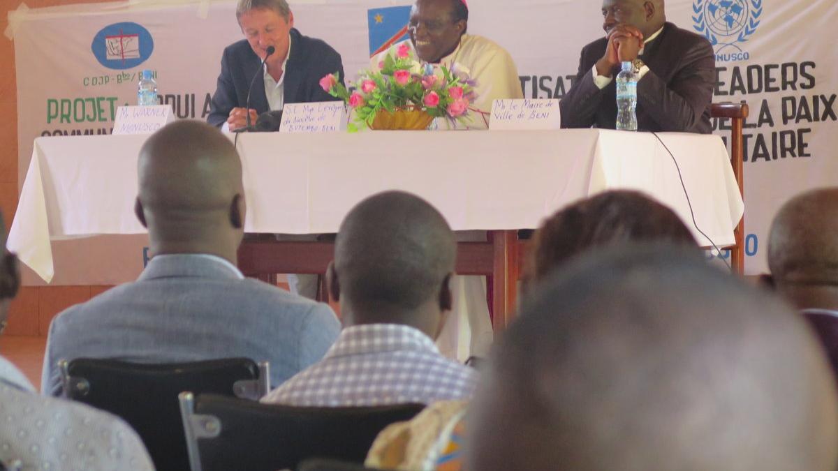 A l’initiative de la Commission Diocésaine Justice et Paix du Diocèse de Butembo-Beni, en partenariat avec la MONUSCO, un « Forum de Paix de sensibilisation et de conscientisation des leaders communautaires sur la culture de la Paix » a débuté ce lundi 02 octobre 2017 à Beni. Deux jours durant, autour de thèmes aussi divers que : « l’humanité en tout homme fondement de la paix ; les fonctions régaliennes de l’Etat et la gouvernance sécuritaire participative ; la non-violence : mode de revendication pacifique etc », les participants à ces assises, une centaine, des leaders religieux, des chefs coutumiers, des chefs des entités territoriales décentralisées, des représentants des Organisation de la Société civile des territoires de Beni et de Butembo et des villes de Beni et de Butembo vont tenter « d’identifier les vraies racines de la perturbation de la Paix dans la région et les moyens pour y remédier ».