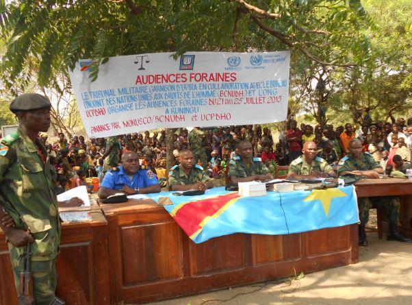 Uvira, le 24 juillet 2015 – Quatre jours durant, soit du 21 au 24 juillet 2015, le Tribunal Militaire de Garnison d'Uvira, siégeant en matière répressive au premier degré, a organisé des audiences foraines à Runingu à une vingtaine de kilomètres d'Uvira au Sud-Kivu.