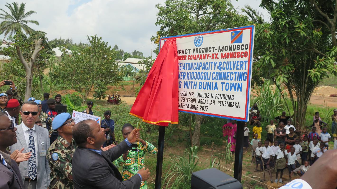 Bunia, 15 juin17 - Le Gouverneur de la province de l’Ituri, Abdallah Pene Mbaka, a inauguré le 14 Juin 2017 un pont construit par la Monusco à travers son bataillon de génie Népalais sur le ruisseau Kidjogoli, dans la ville de Bunia.