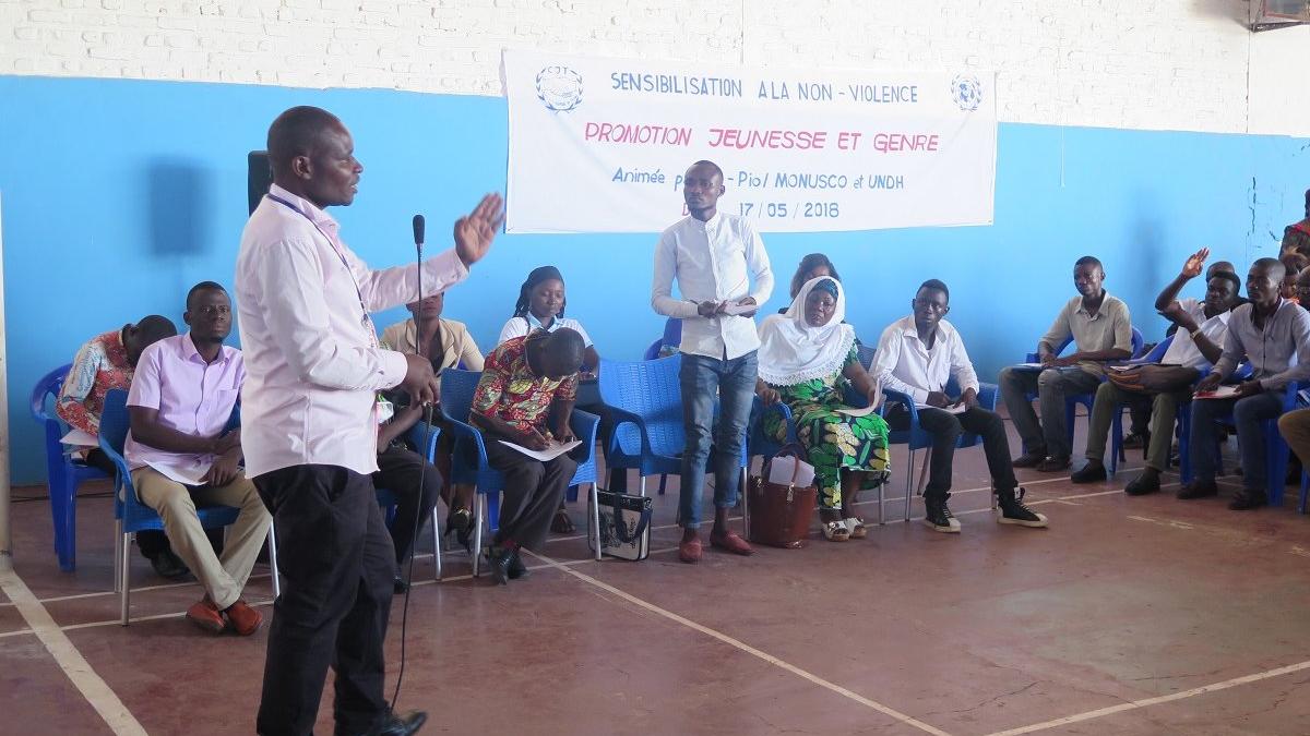 Kalemie, le 17 mai 2018 – La Section de l’Information publique de la MONUSCO, à Kalemie, en partenariat avec le Conseil de la Jeunesse du Tanganyika, poursuit son programme mensuel de sensibilisation à la non-violence en période électorale.