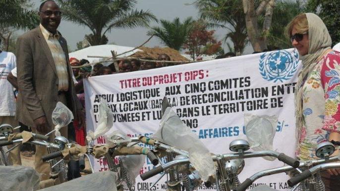 Kalemie, 4 Août 2016 – C’est dans la localité de Mbayo, 112 kms de la ville de Manono en Territoire de Manono, dans la province du Tanganyika, que s’est déroulée le 4 août 2016, la cérémonie de remise officielle d’un lot de 70 bicyclettes financés par un projet à impact rapide. D’un montant de 24.000 dollars US, ce projet a été conçu pour soutenir les efforts de réconciliation et de pacification communément appelé « processus Baraza » mis en place dans le cadre du règlement du conflit intercommunautaire Pygmée-Luba. Pour ce faire, les cinq comités « Baraza » installés dans divers villages du territoire de Manono, notamment Mbayo, Mukebo, Kabeke, Sange et Nsengatshibum, reçoivent ainsi un appui de la MONUSCO en équipement pour faciliter leur travail.